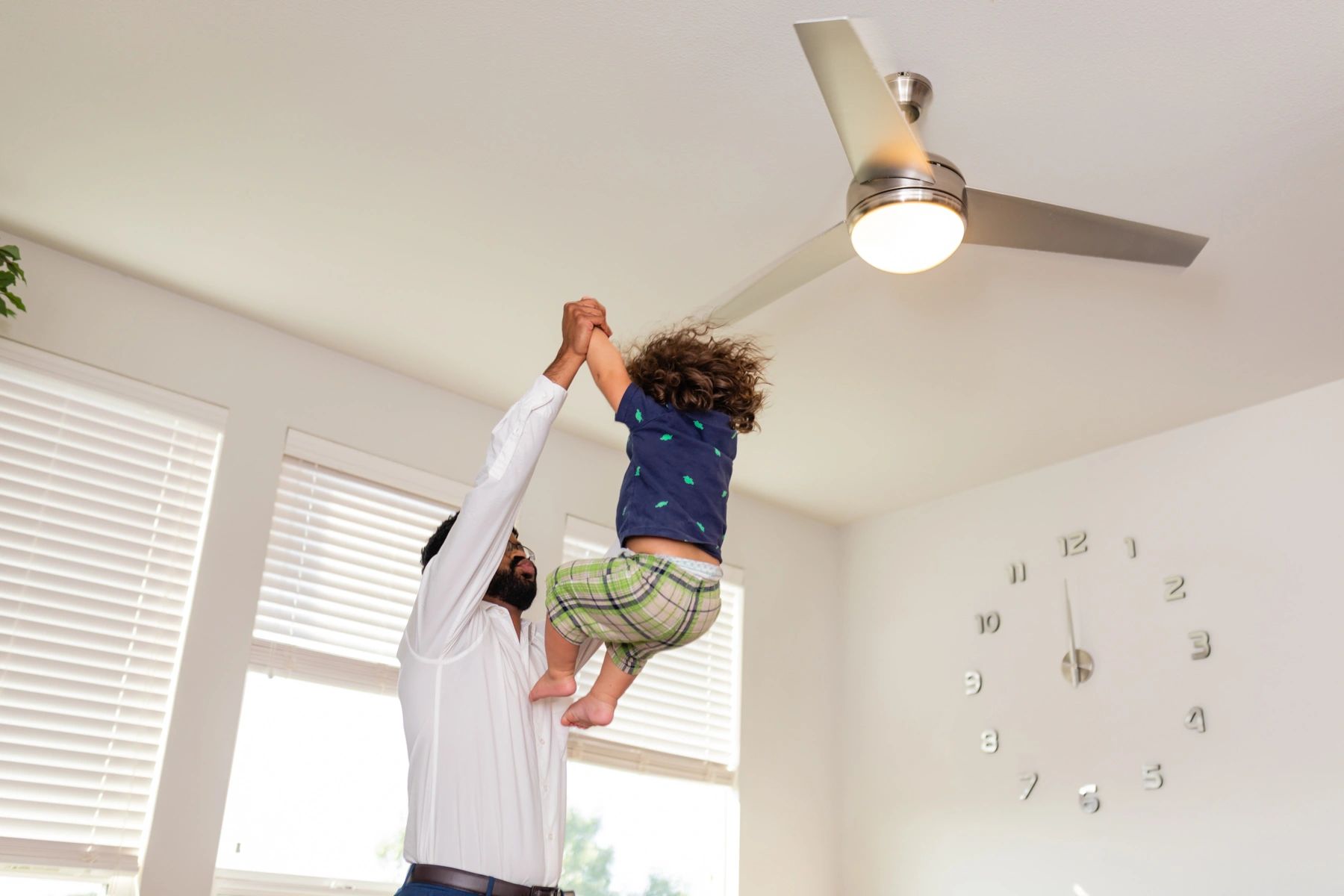 During the summer, when your fan is spinning counterclockwise, those angled blades help move air down.